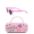 Open the sunroof, crank up the tunes, and let the rays shine in! These pink cat eye shaped sunglasses will provide safety AND style all summer long! With a coordinating glitter clamshell closure case (featuring the sweetest and sparkliest butterfly, heart, and daisy appliqués!), this sunnies set is the ultimate edition to their days of fun in the sun!
