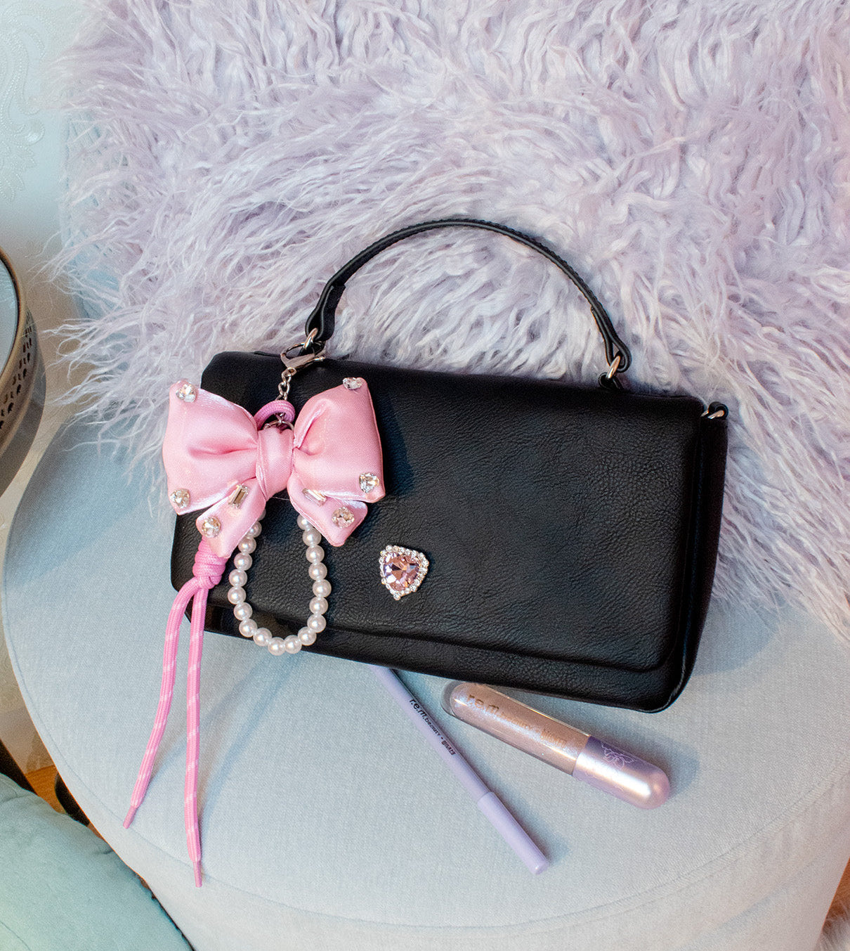 This black rectangular top-handle crossbody bag is every mini fashion lover's dream! Detailed with a rhinestone heart snap closure, and detachable pink bow bag charm with a beaded pearl strand, it's the ultimate bag for the girl with a passion for fashion!
