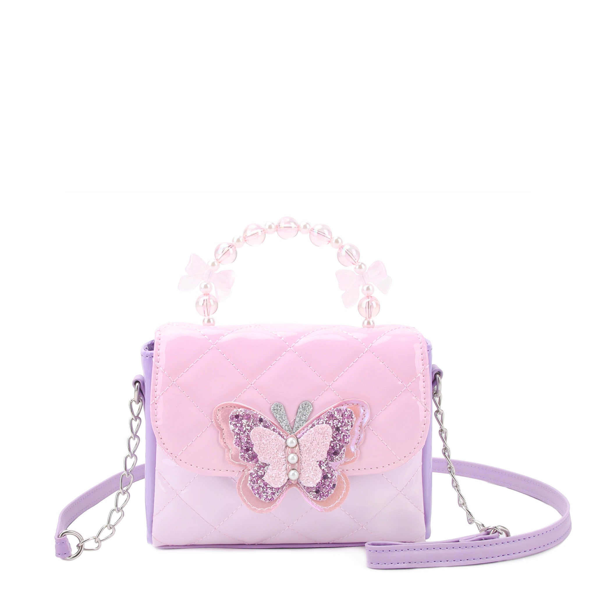 Calling all butterfly lovers! Our pink and purple color blocked mini crossbody bag will make your mini want to spread their wings and fly! Detailed with a beaded top handle, glitter butterfly appliqué, and adjustable crossbody strap for the perfect fit.
