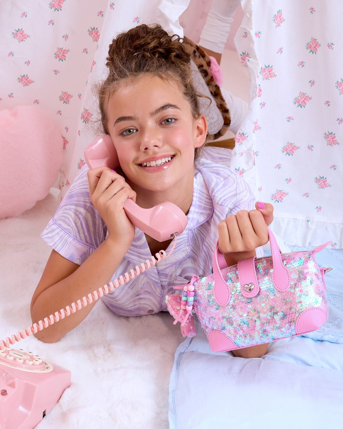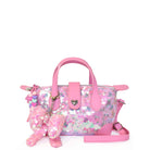 Dress them to impress with this high-shine pouchette style mini bag dazzled in sequins. Detailed with faux leather handles, snap closure, and puffy pink sequins bow charm. Wear it as a mini bag or crossbody bag... let them decide!