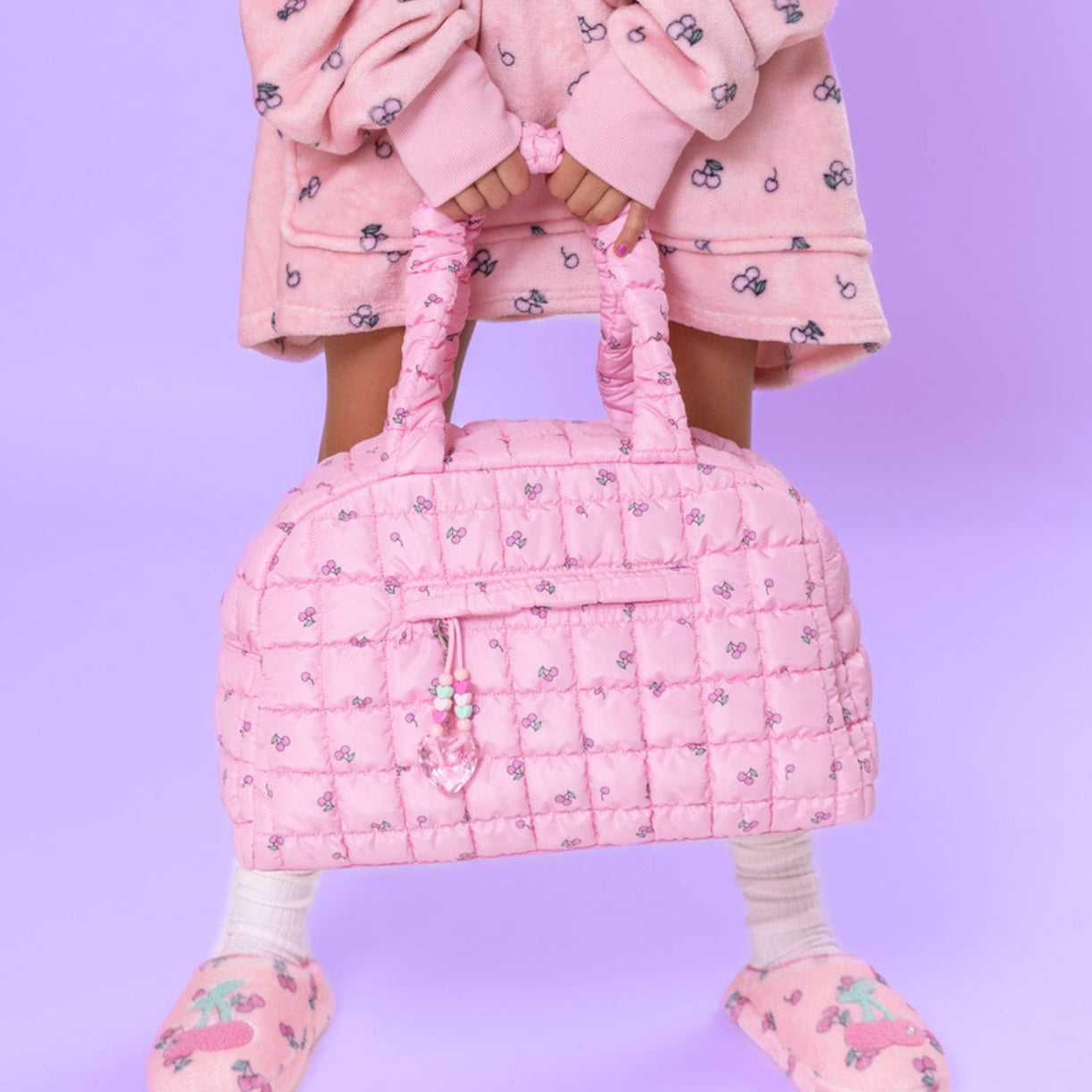 Where style meets versatility, our favorite duffle bag silhouette gets a trendy upgrade! From their extra circulars, to the gym, dance class, weekend getaways, and everywhere else in between - they'll be carrying it all in our new nylon quilted pink cherry printed medium scrunch duffle bag- with pink cherries and a zipper closure front pocket. Crystal heart charm included!
