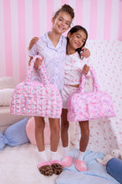 Flower Power! Our favorite duffle bag silhouette just a trendy upgrade! Covered in our newest lollipop pink ditzy floral, this medium scrunch duffle features scrunchy straps, a roomy interior, & a crystal-heart bag charm on the zipper of the extra front compartment. Perfect for sleepovers, dance class, or weekend adventures!