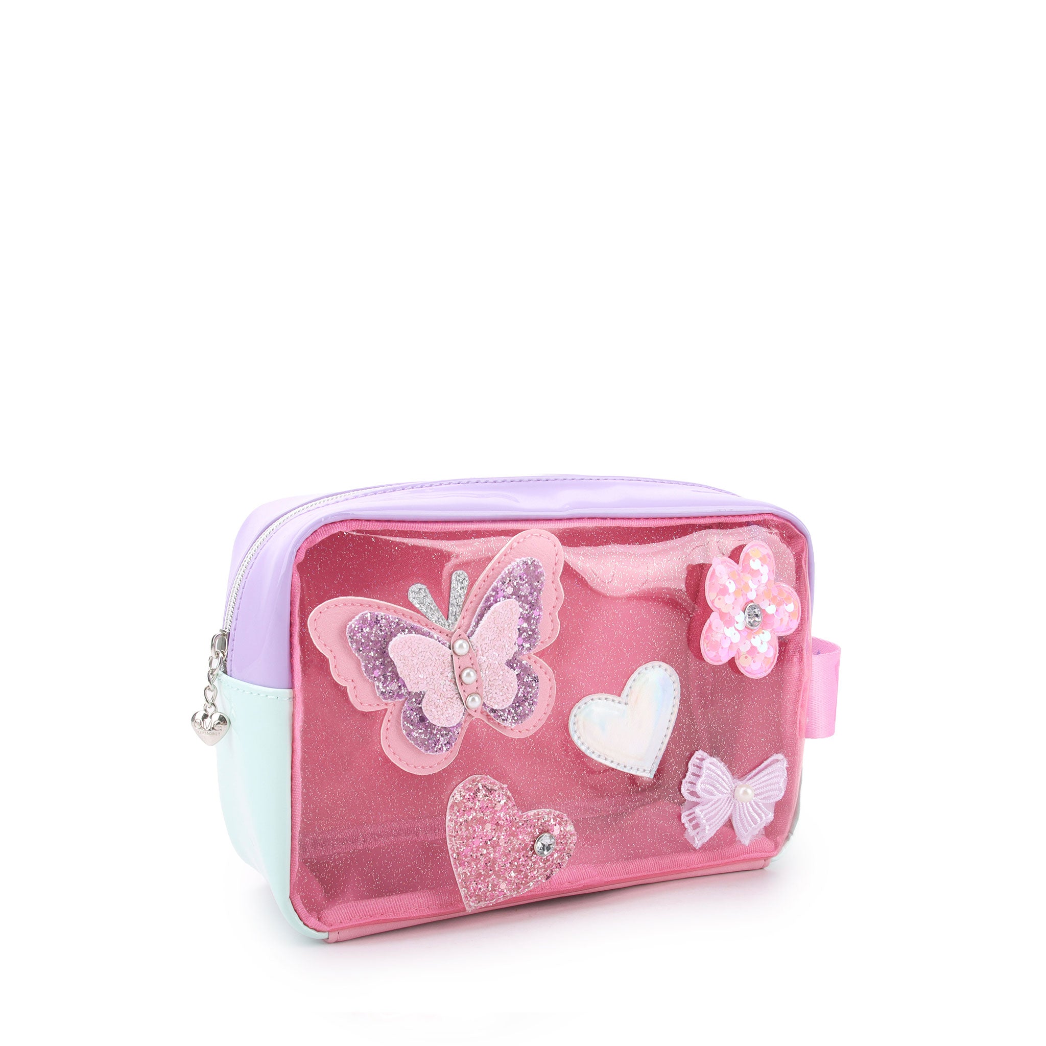 Butterflies, flowers, and hearts- oh my! This glittery clear tinted pouch is a beauty essential! Detailed with butterfly, hearts, and flower patches and a mini side strap so you can clip it to your bag!