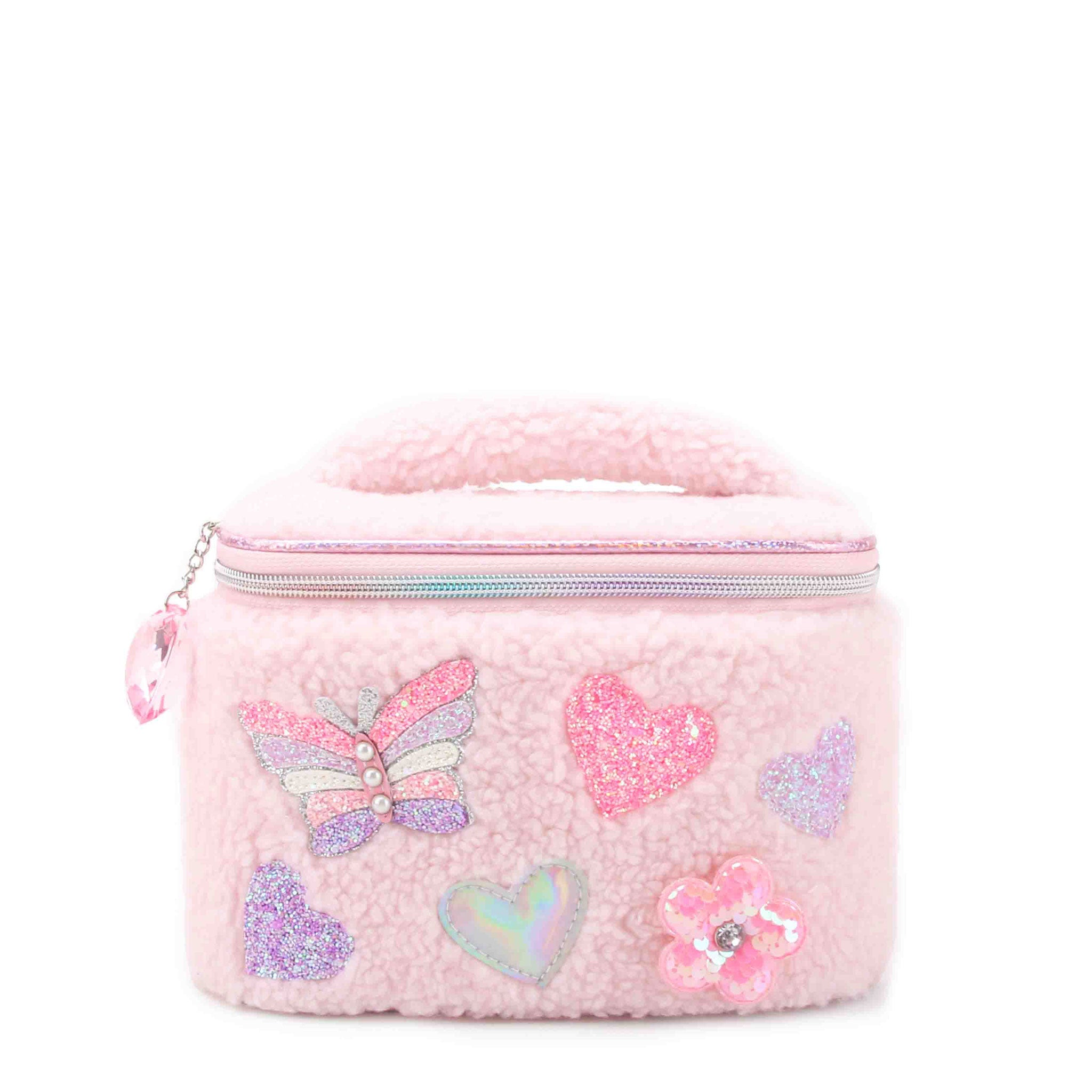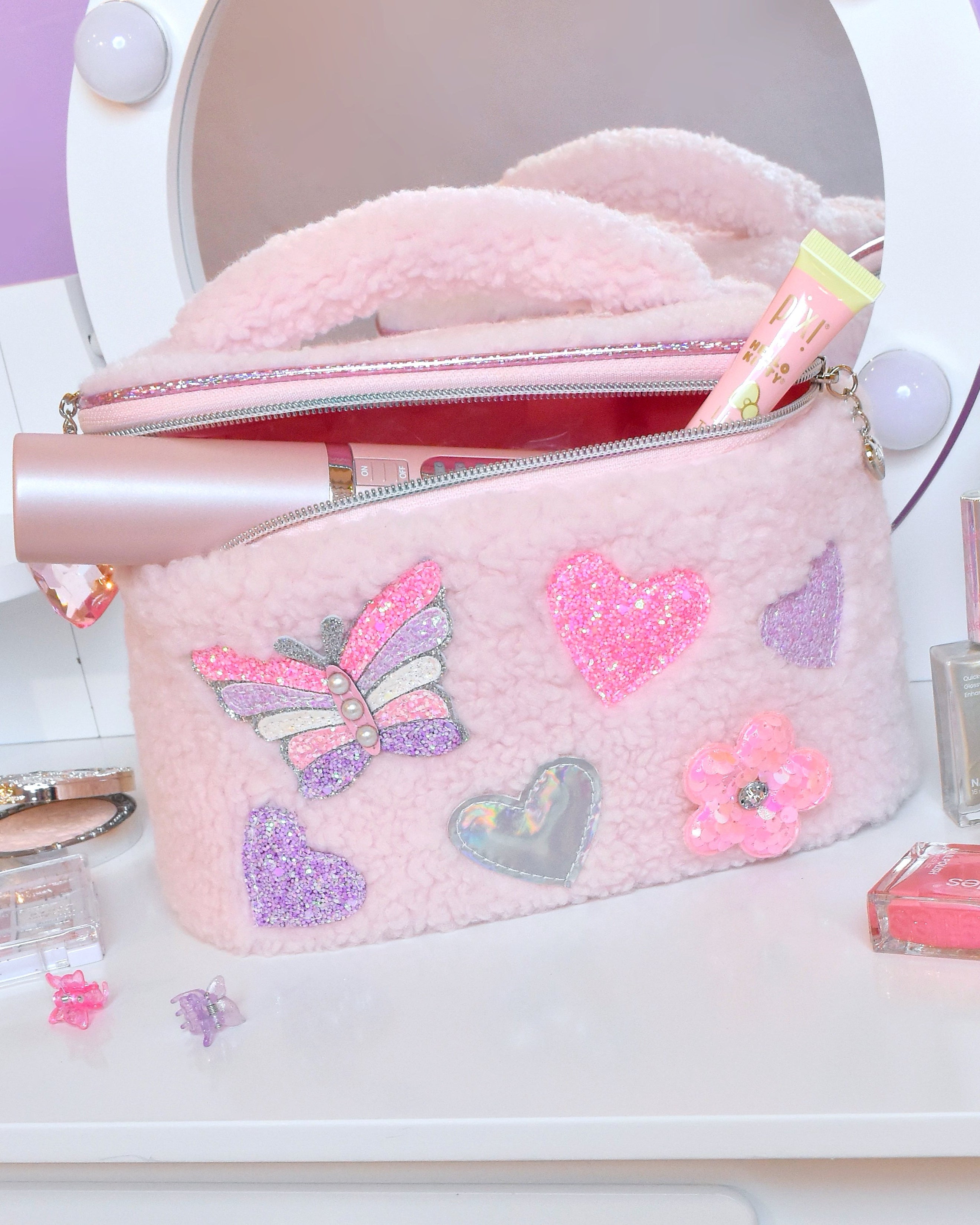 Butterflies, flowers, and hearts - oh my! This pink sherpa glam bag is a beauty essential! Detailed with glitter, sequins and holographic butterfly, hearts, and flower patches and a pink crystal heart bag charm!