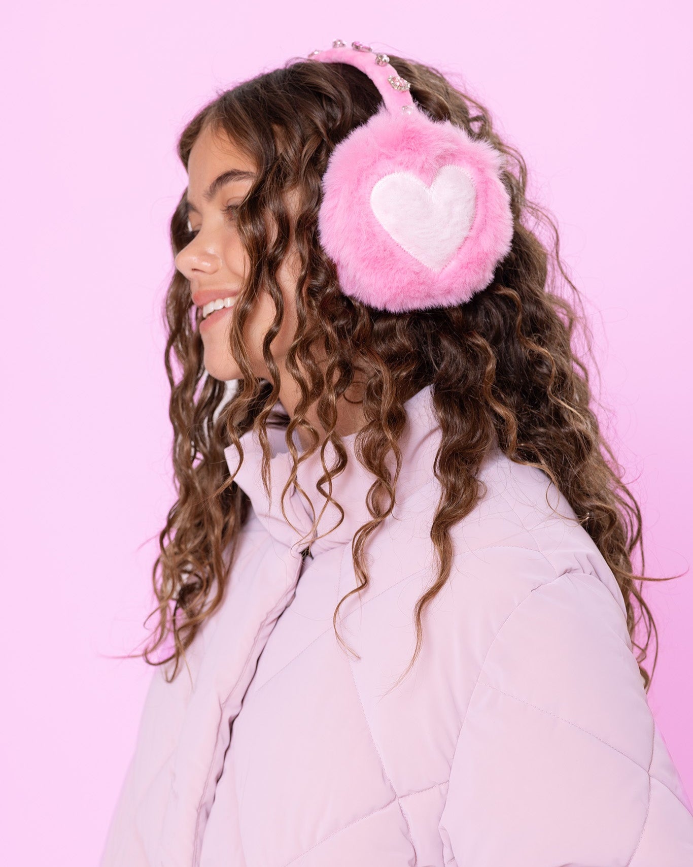 Add a little sparkle to chilly days with our new warm & fuzzy earmuff sets! These cotton candy pink earmuffs feature plush padded ear covers with a lollipop pink heart, and a bedazzled headband. Includes matching pink gloves - this set is a must-have for girls who want to glam up their cold-weather wardrobe.
