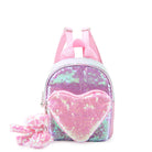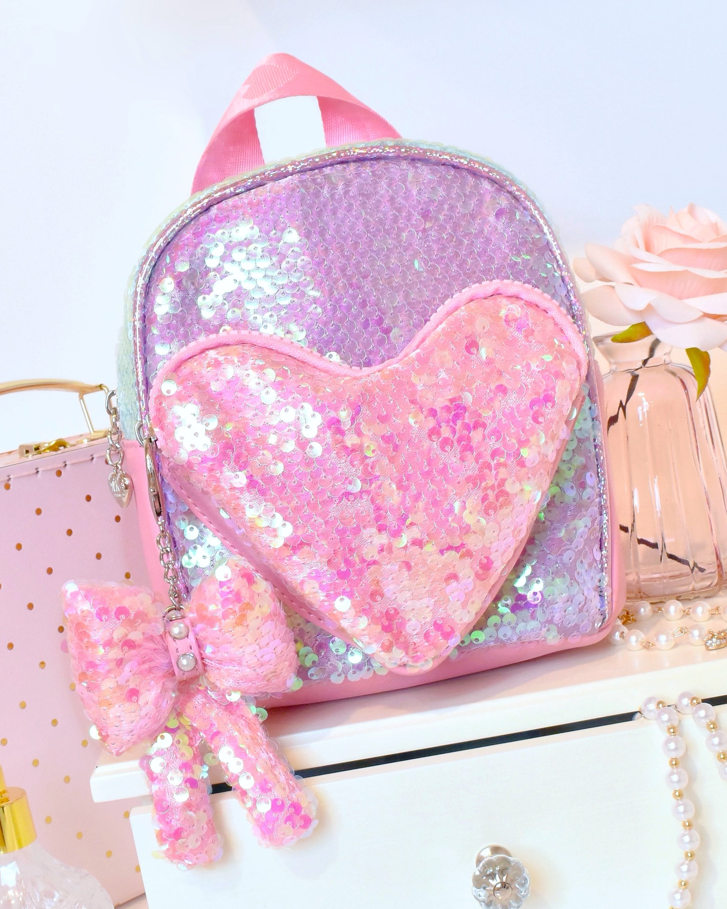 Small in size but big in style, our *brand new* color blocked sequins micro mini backpack is covered in our pink & lavender high-shine sequins, and features a heart shaped zipper closure front pouch, adjustable straps, and 3D detachable pink sequins bow bag charm!