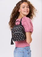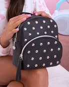 Edgy meets chic with our new, black studded micro mini backpack! Covered in bold silver rounded studs for a cool, fashion-forward finish. This compact backpack features two zippered compartments, with a tassel puller and adjustable straps for comfortable carrying! It's the perfect pop of attitude to any outfit!