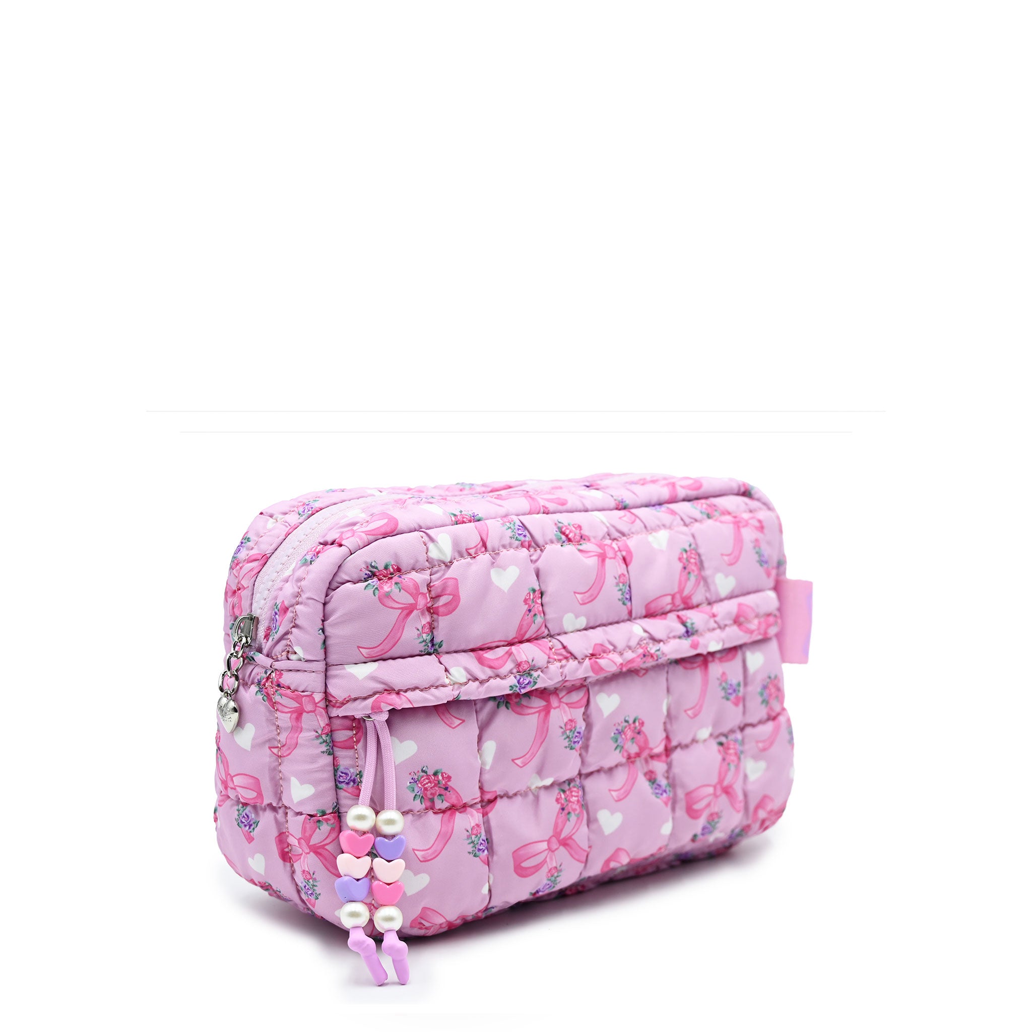 A girly girl's dream! Our classic scrunch pouch just got a flirty new upgrade! This quilted pink floral bow printed pouch is a must-have for your mini's GRWM routine. With a beaded zipper closure front pocket for extra storage, it's the packing essential every little princess needs!