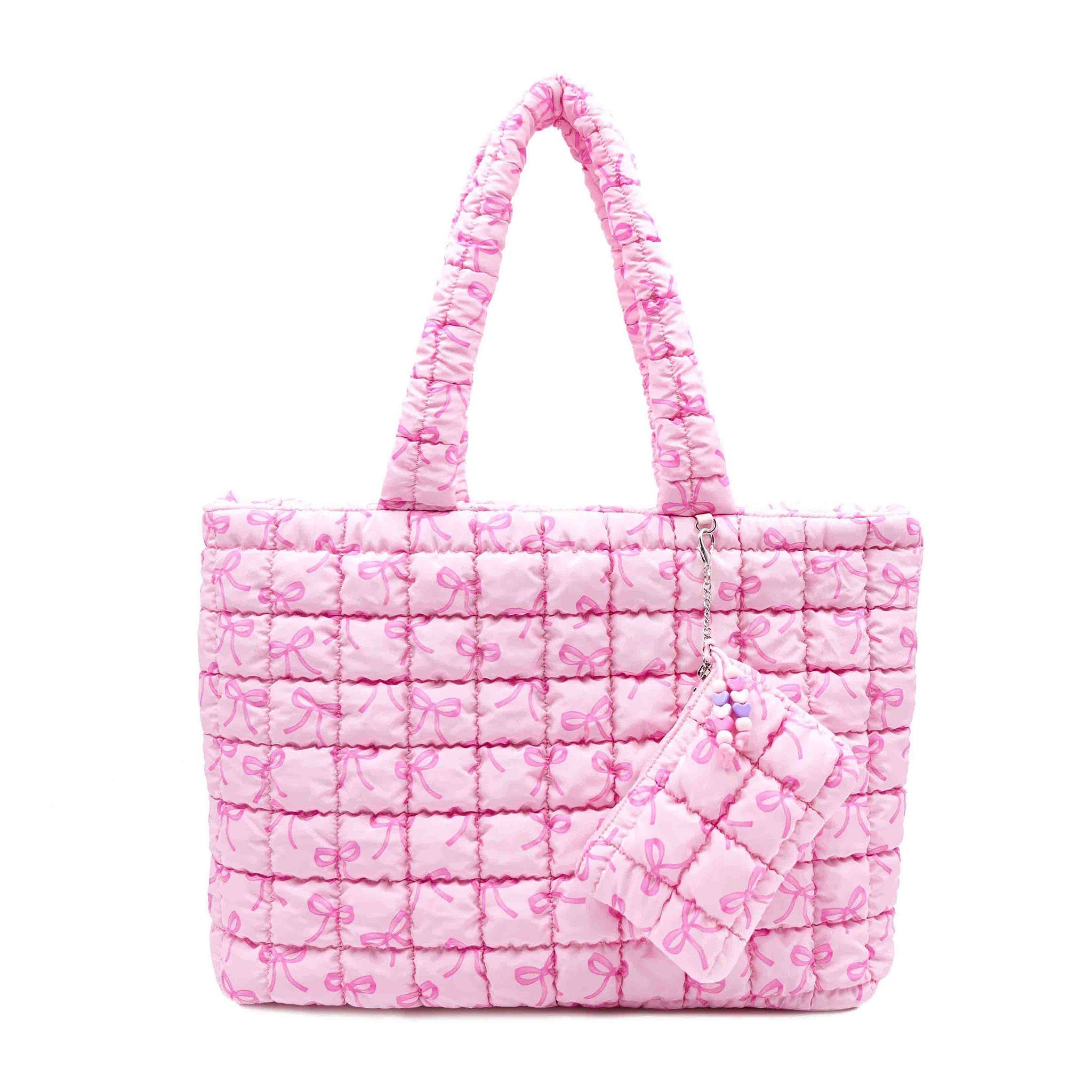Where style meets versatility! From their extra-curriculars, to the gym, dance class and everywhere else! They'll be carrying it all in our newest quilted scrunchies tote bag in our pink peony floral bow print. Detachable coin purse with beaded bag charm puller included .