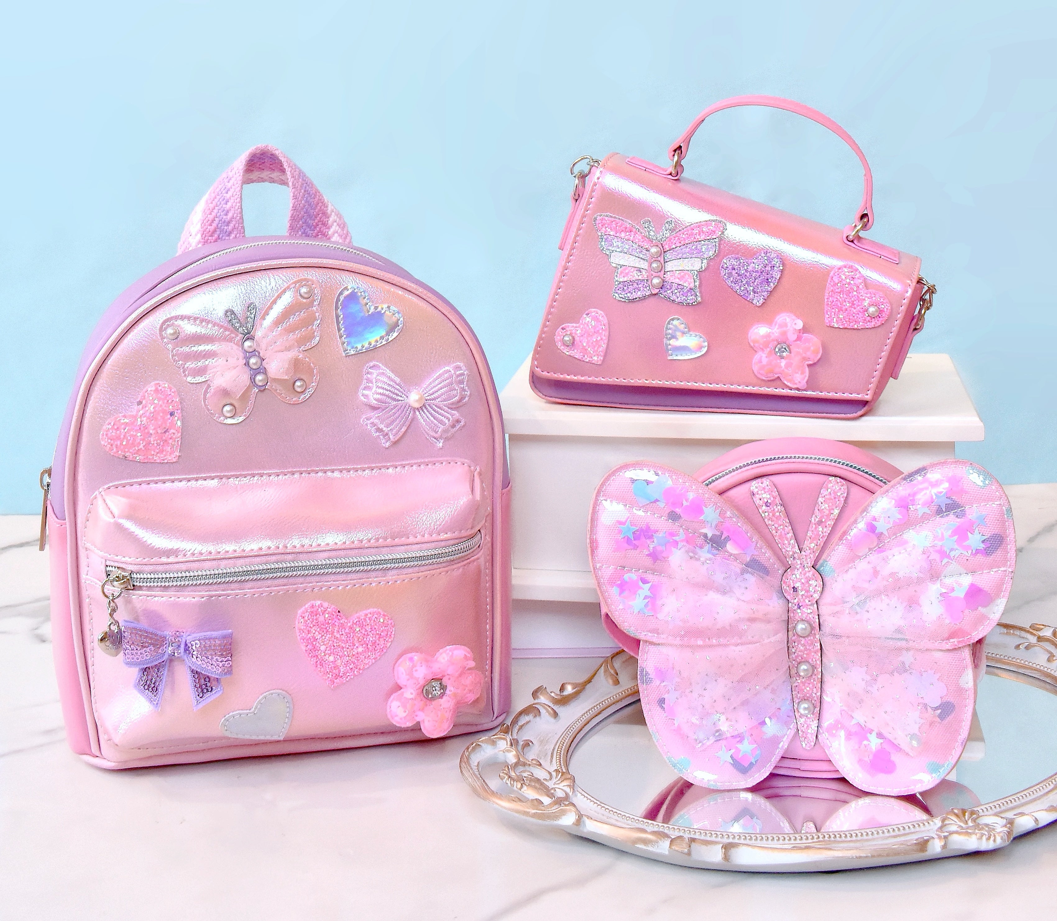Calling all butterfly lovers! Our round, pink, confetti butterfly crossbody bag will make your mini want to spread their wings and fly! Detailed with a butterfly printed adjustable crossbody strap for the perfect fit.