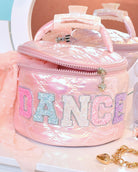 Your mini will steal the spotlight with this pink metallic quilted round glam bag! Detailed with glitter 'DANCE' varsity letter patches. Your tiny dancer can keep their beauty essentials compact and near on and off stage!