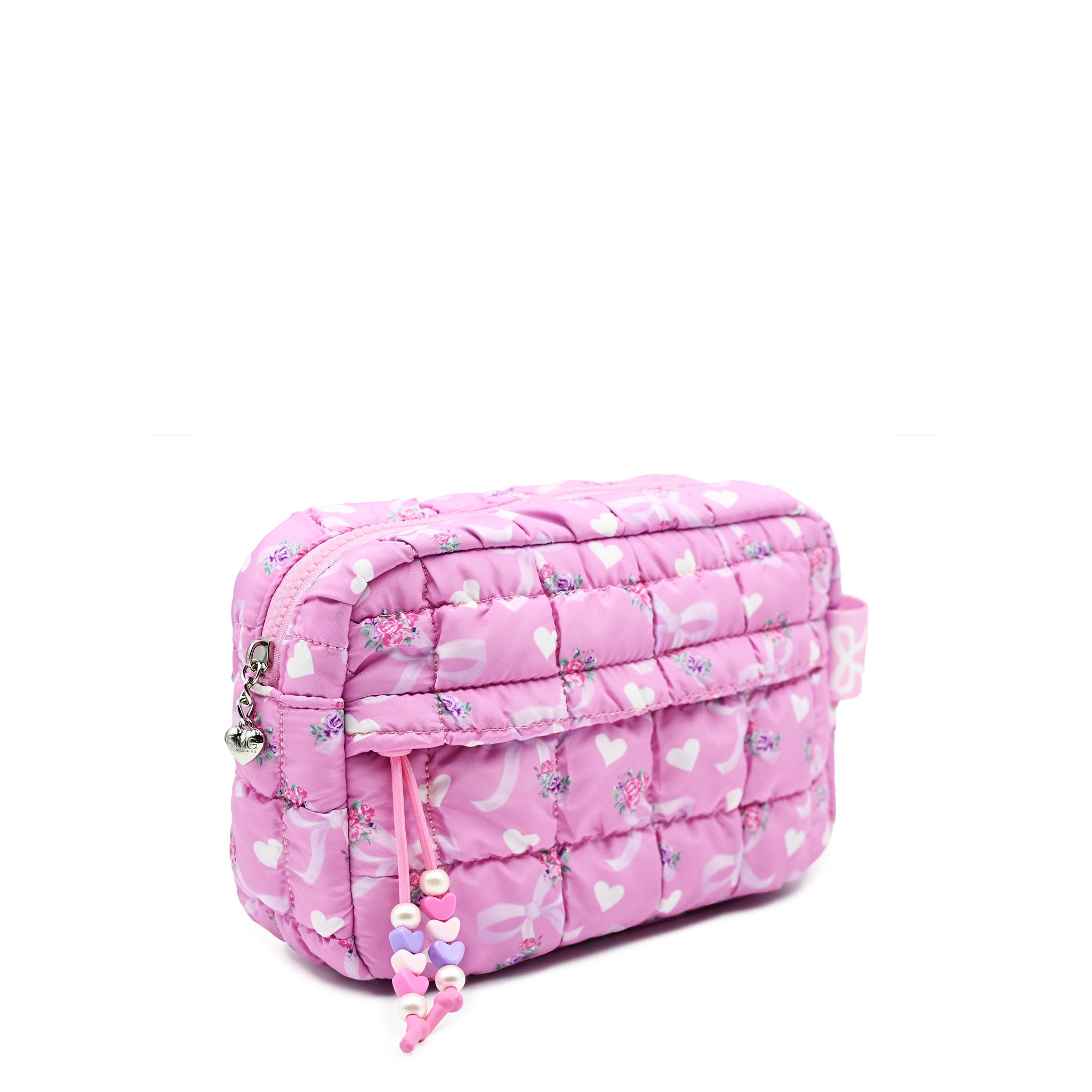 A girly girl's dream! Our classic scrunch pouch just got a flirty new upgrade! This quilted pink floral bow printed pouch is a must-have for your mini's GRWM routine. With a beaded zipper closure front pocket for extra storage, it's the packing essential every little princess needs!
