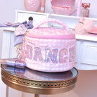 From dance class to competition, the sparkle starts here! With our newest quilted scrunchies round glam bag in our NEW pink gingham print! Detailed with shimmering sequins "DANCE" varsity letters, a beaded heart bag charm, and zip-around closure. It's the perfect bag for storing makeup, hair accessories, and recital essentials.