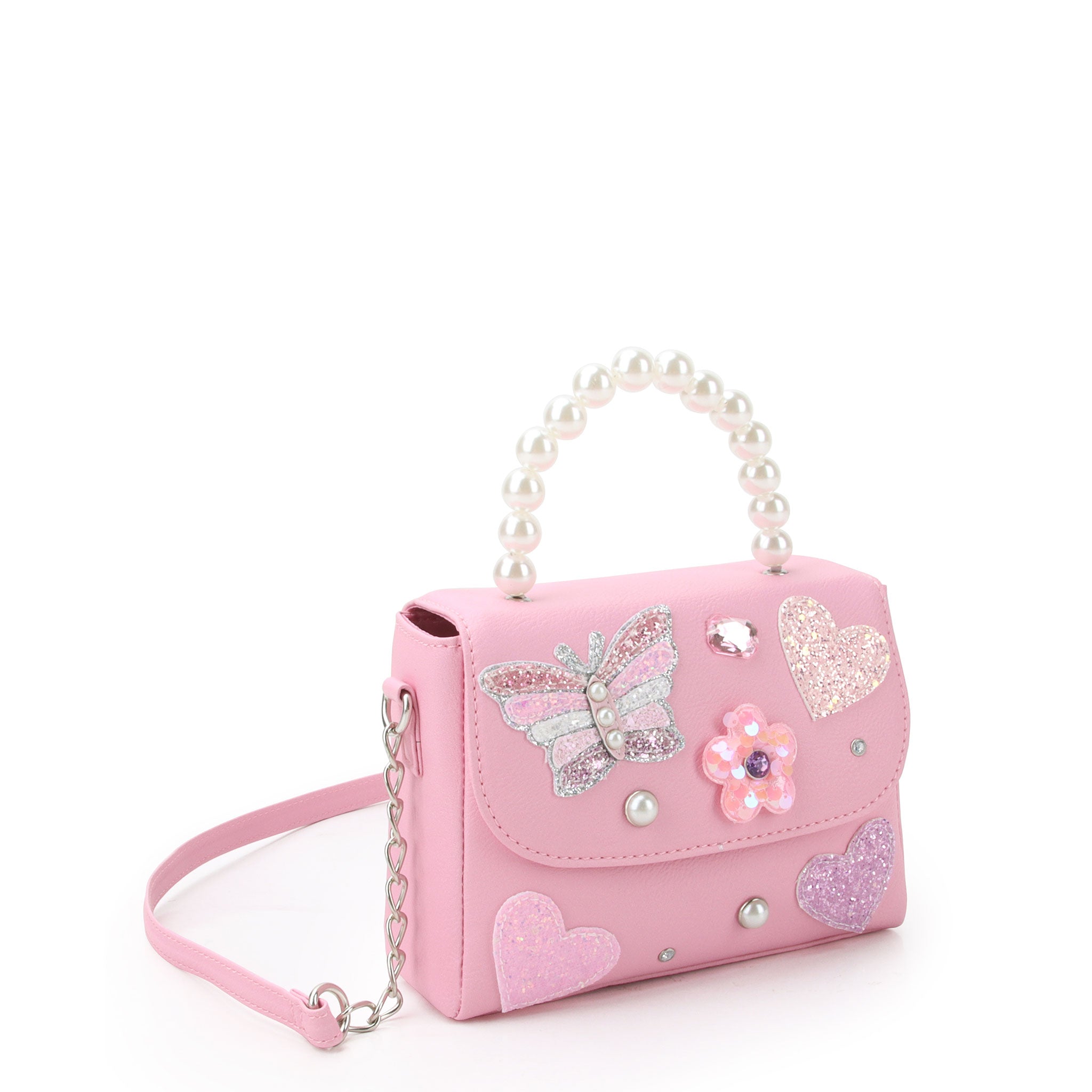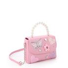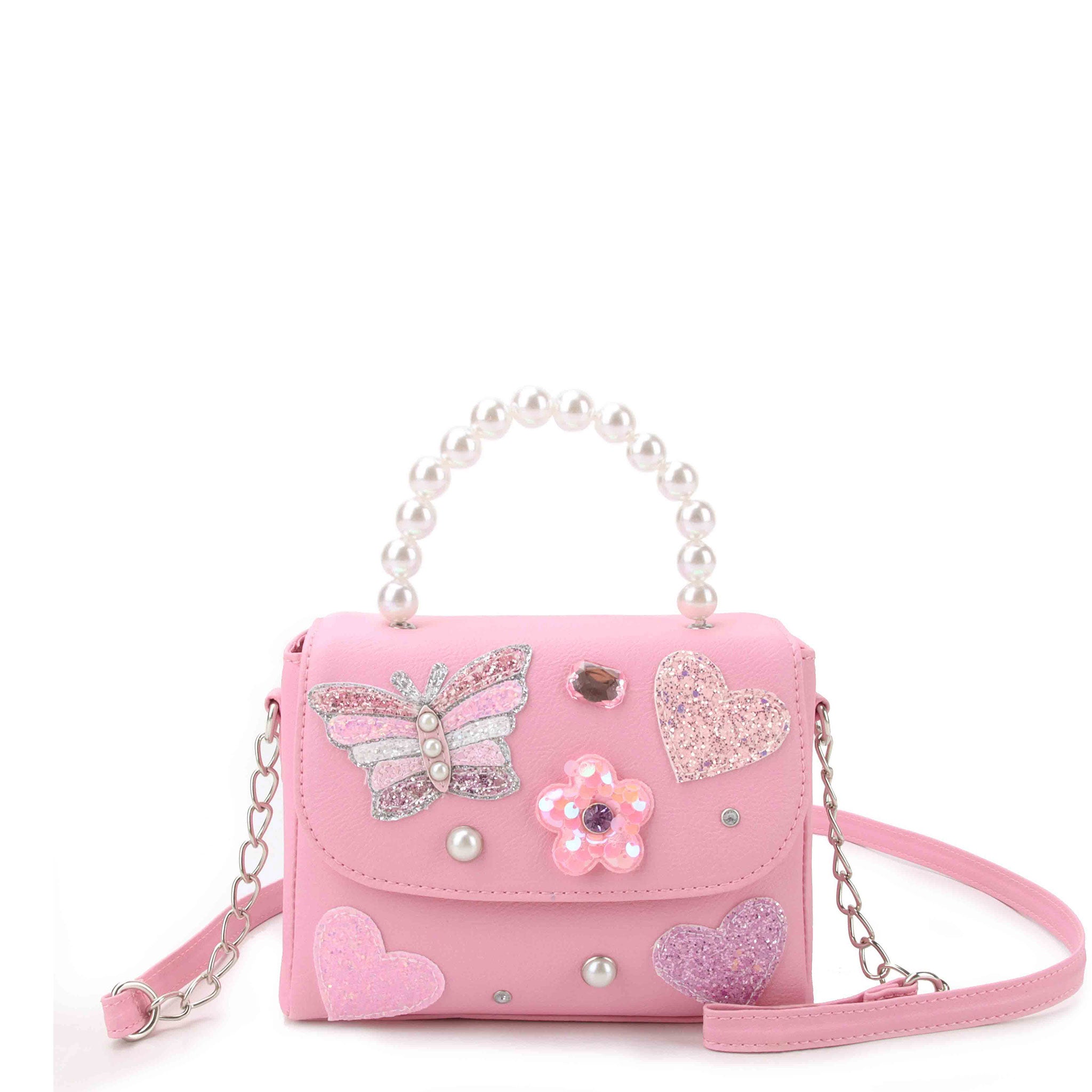 Bring the charm wherever she goes with our applique top handle bag! Crafted in a peony pink exterior, this top handle bag features glittery butterfly, flower, and heart appliqués, as well as a pearl beaded handle + magnetic button closure. It's compact size makes for easy carrying for sunnies, chapstick, & all the everyday essentials they may want right by their side!