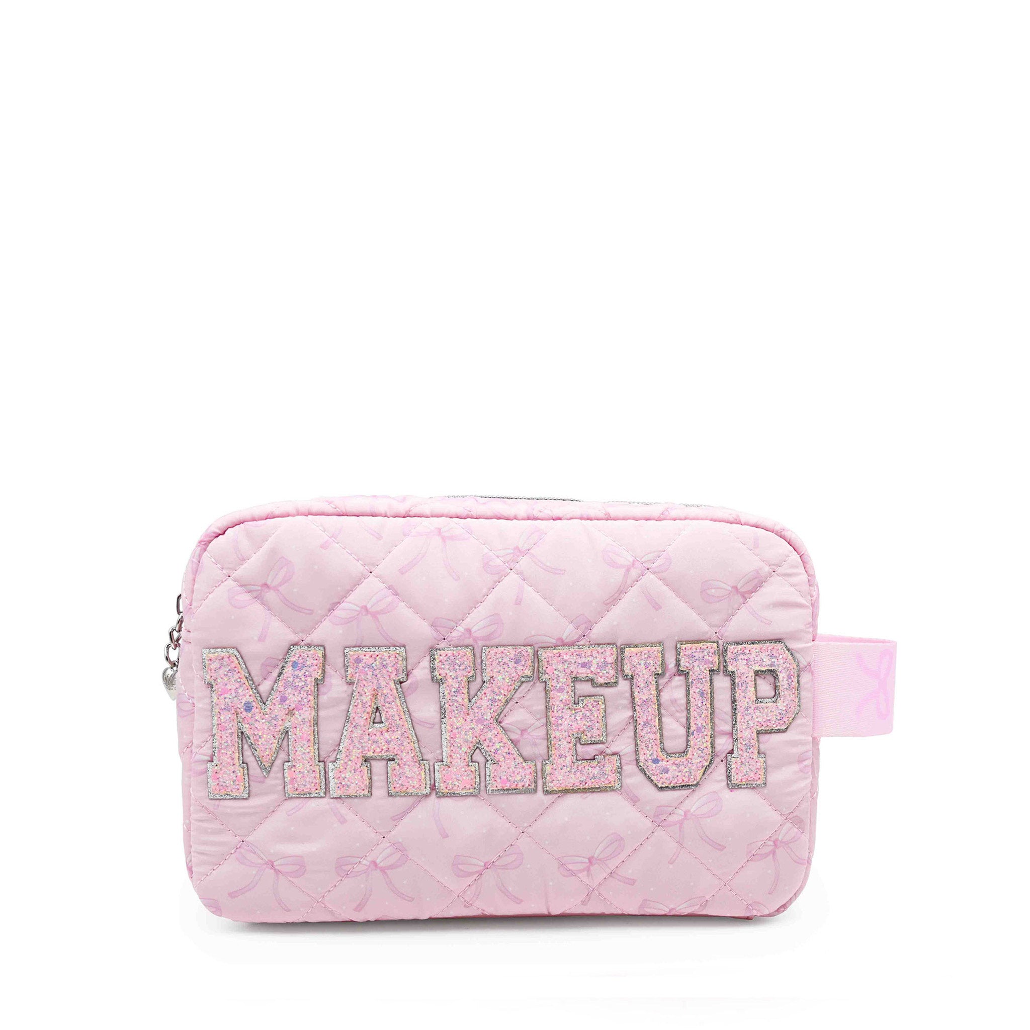 Make every glam moment sweet with our newest 'makeup' pouch in our NEW powder pink bow print! Detailed with extra glittery varsity letters, this storage essential is a must-have for any makeup lover!