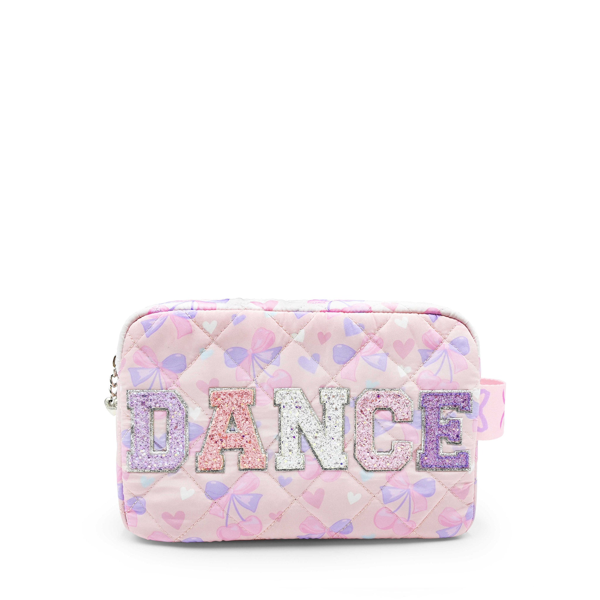 From dance class to competition, the sparkle starts here! With our newest Quilted Scrunchies dance pouch in our cherry bow print! Detailed with shimmering sequins 'DANCE' varsity letters, it's the perfect bag for storing makeup, hair accessories, and recital essentials.