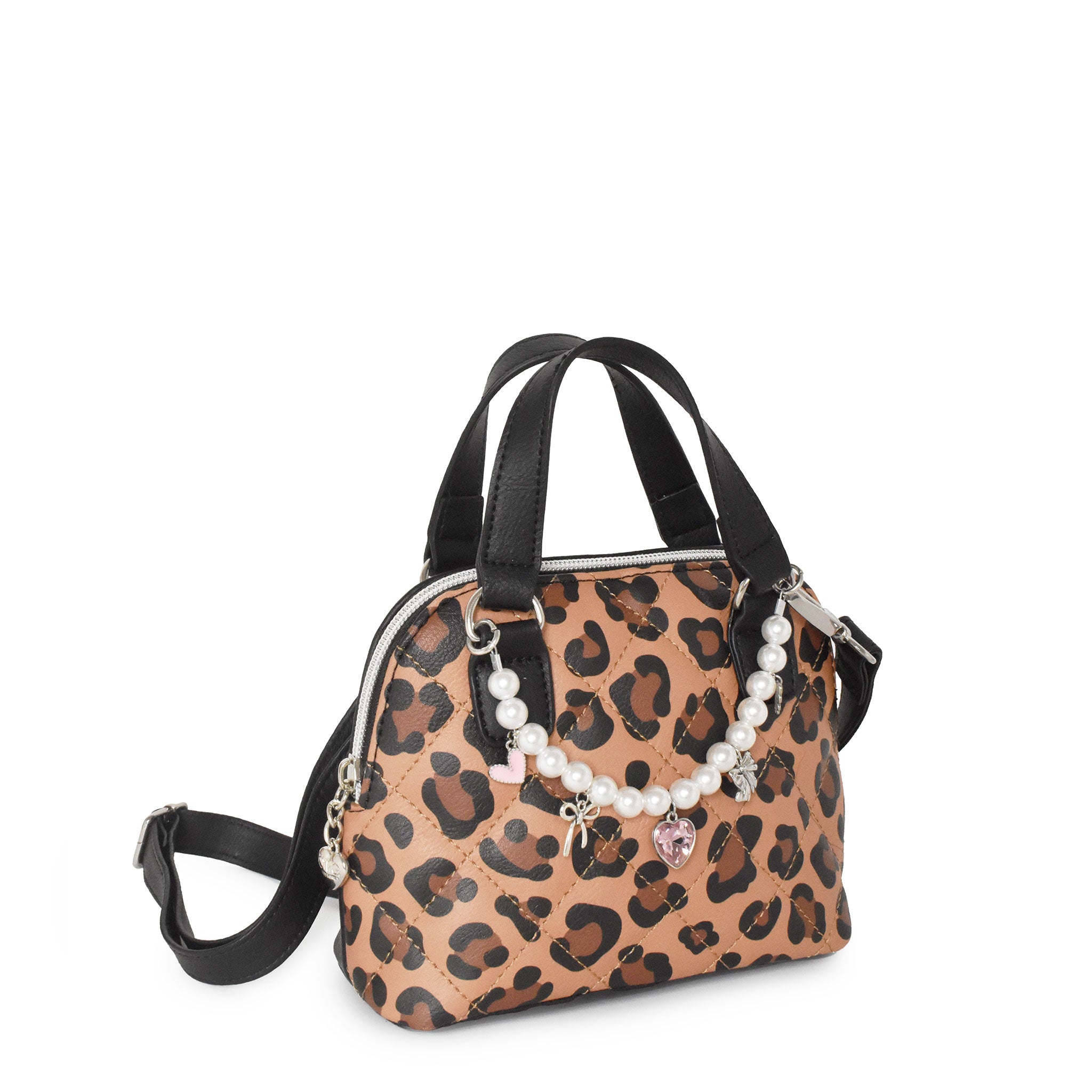 It's a leopard lover's paradise! Our all NEW hearts quilted leopard print satchel crossbody bag is a fashionista's dream! Detailed with a pearl chain decked out in rhinestone heart, ribbon, and super girly themed charms, this top hande mini bag is bound to become a new staple in your little's closet! Featuring an adjustable crossbody strap for comfortable carrying.