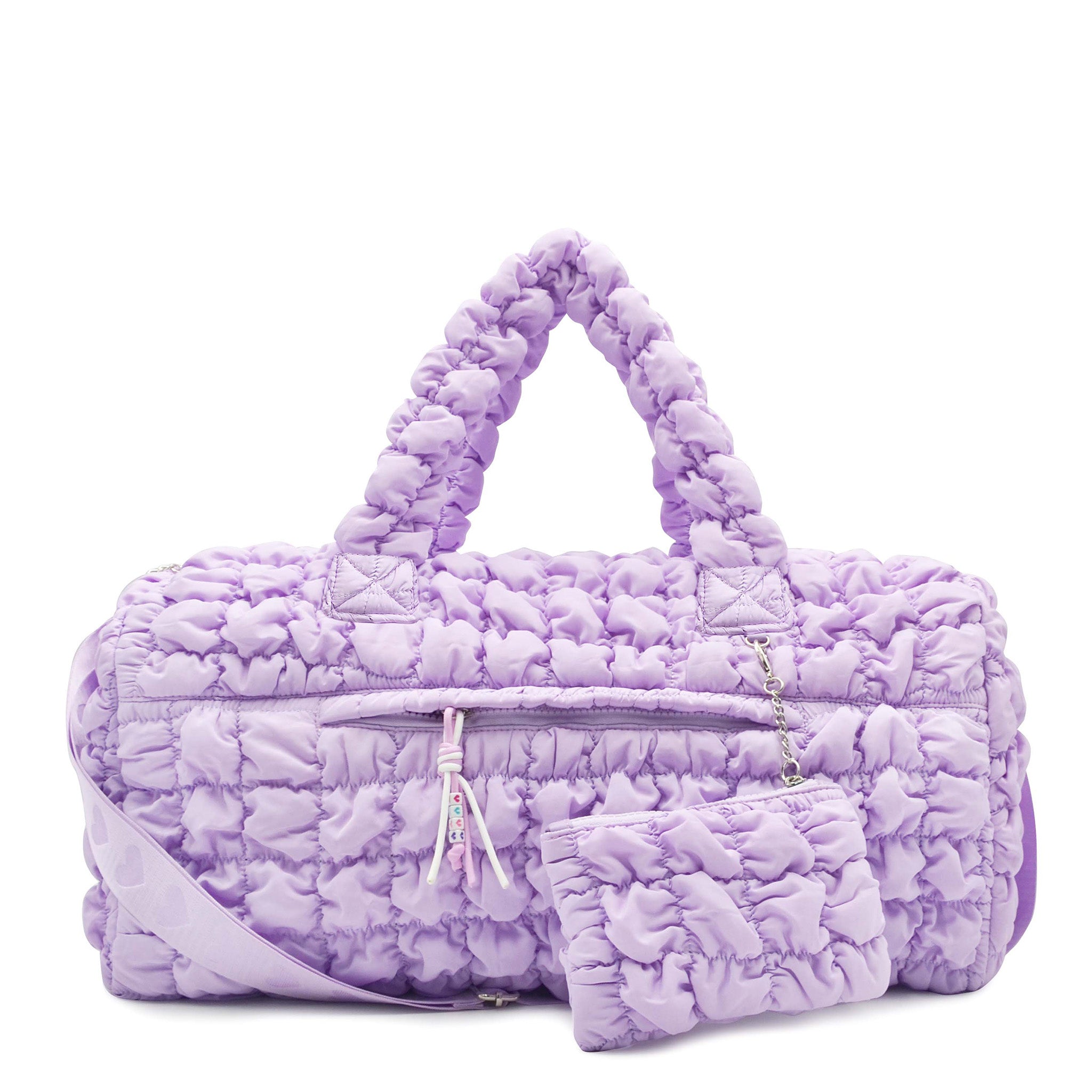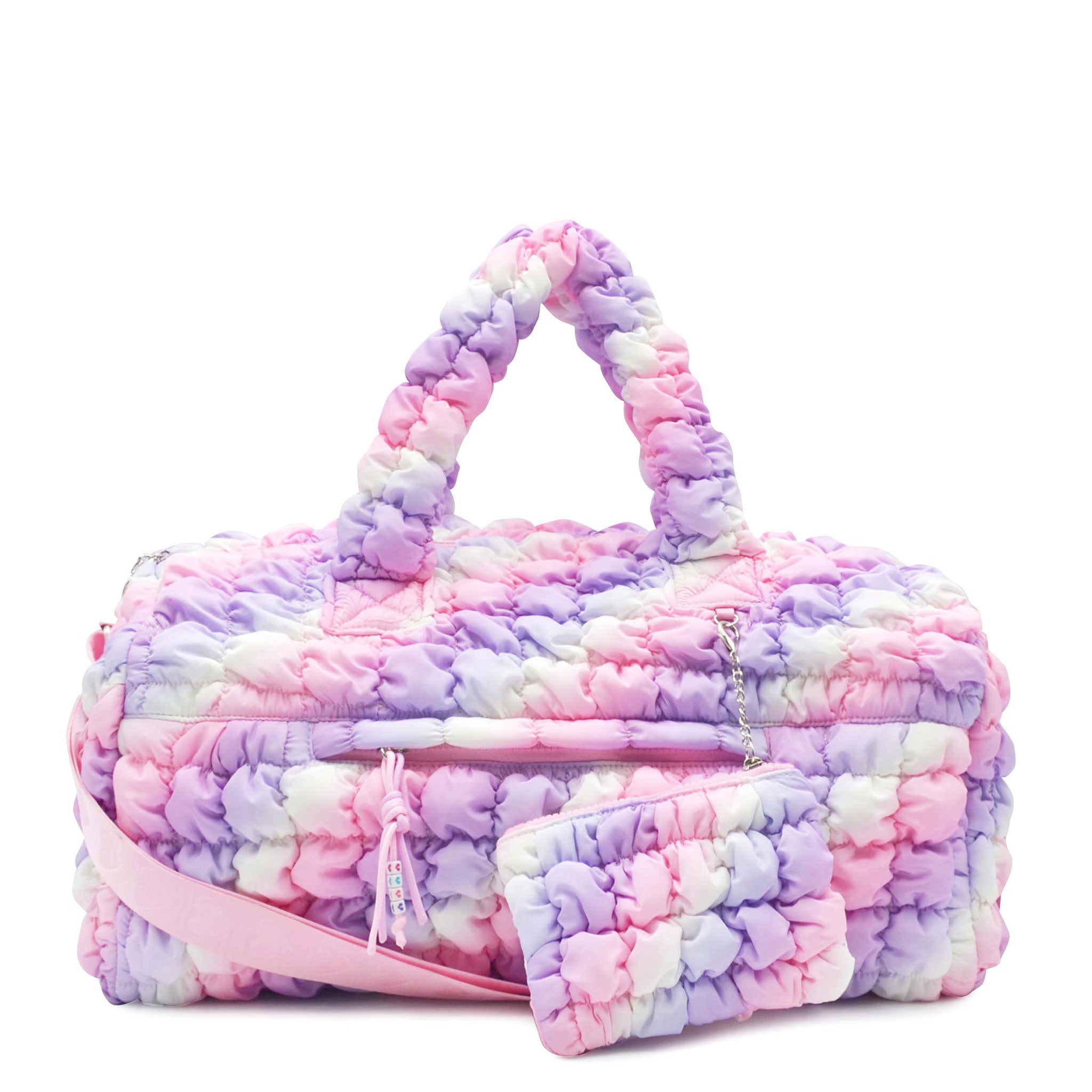 Where style meets versatility, our classic duffle bag silhouette gets a trendy upgrade! From their extra curriculars, to the gym, dance class, weekend getaways, and everywhere else in between - they'll be carrying it all in our new nylon quilted bright ombre print large scrunch duffle bag! Detachable coin purse included.