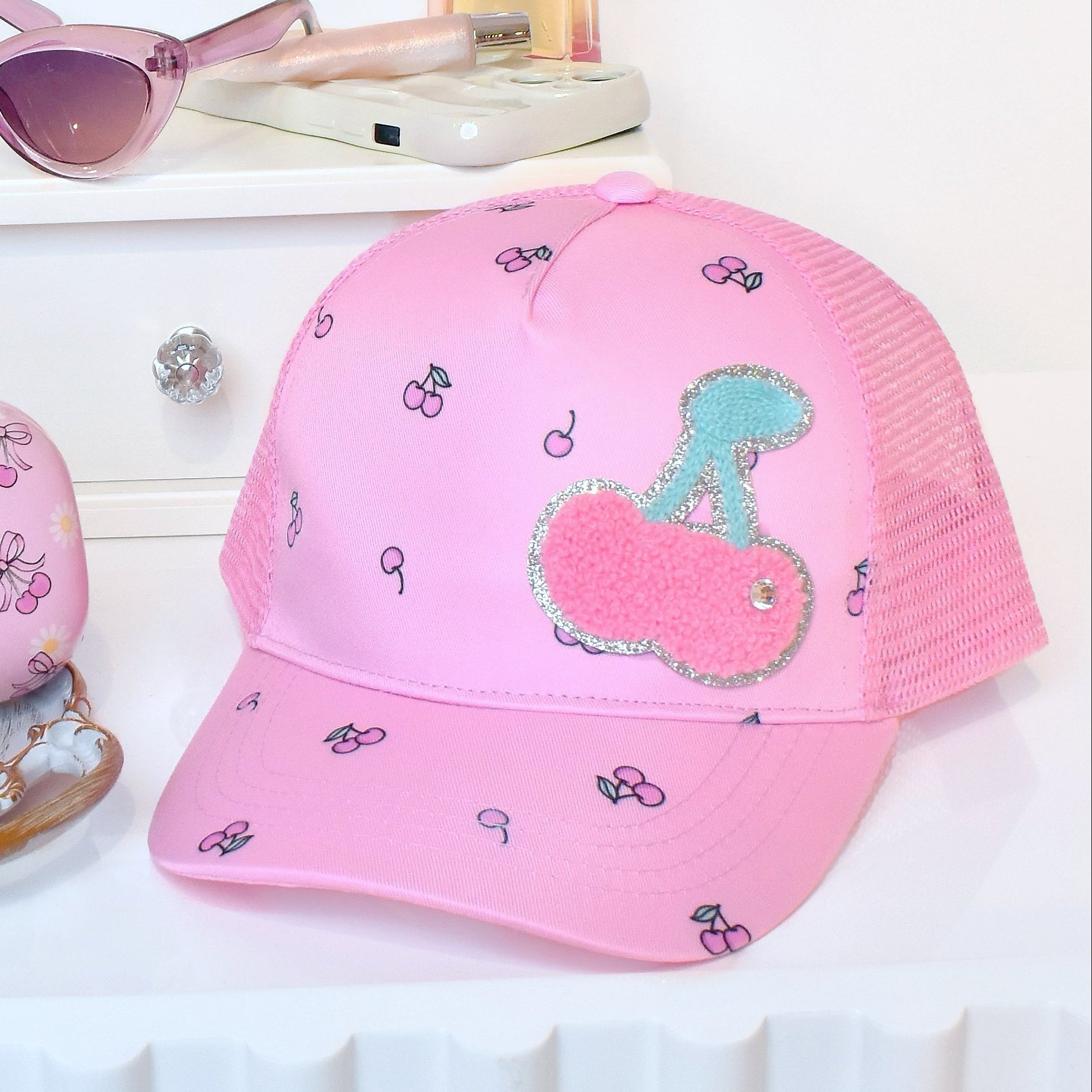 Your mini will be turning heads in our NEW trucker hat! Featuring a pink cherry printed front panel - adorned with a pearl detailed cherry applique patch, a mesh back for breezy comfort, and an adjustable size strap for the perfect fit!