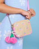 *Cherry* cute! Bring coastal charm wherever she goes with our cherry straw crossbody bag! Crafted in a durable woven straw, this tote features embroidered pink cherries, and a detachable cherry pom-pom and pearl bow bag charm.