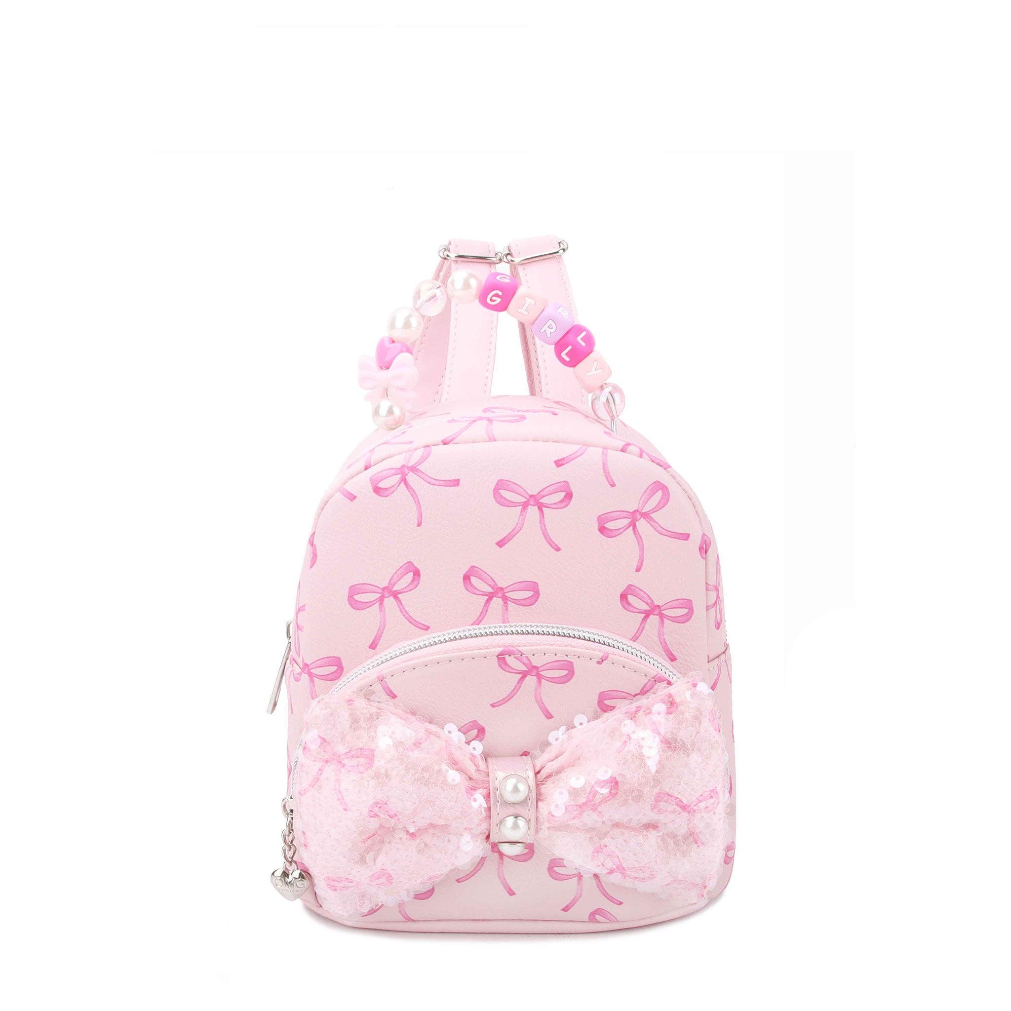 Sweet, stylish, and ready to go-- our newest pink bow printed micro mini backpack is the ultimate accessory for on-the-go adventures and hands-free fun! Designed in our classic bow print and embellished with a large sequins bow and beaded 'GIRLY' top handle, this hands-free essential features adjustable straps for comfortable carrying!
