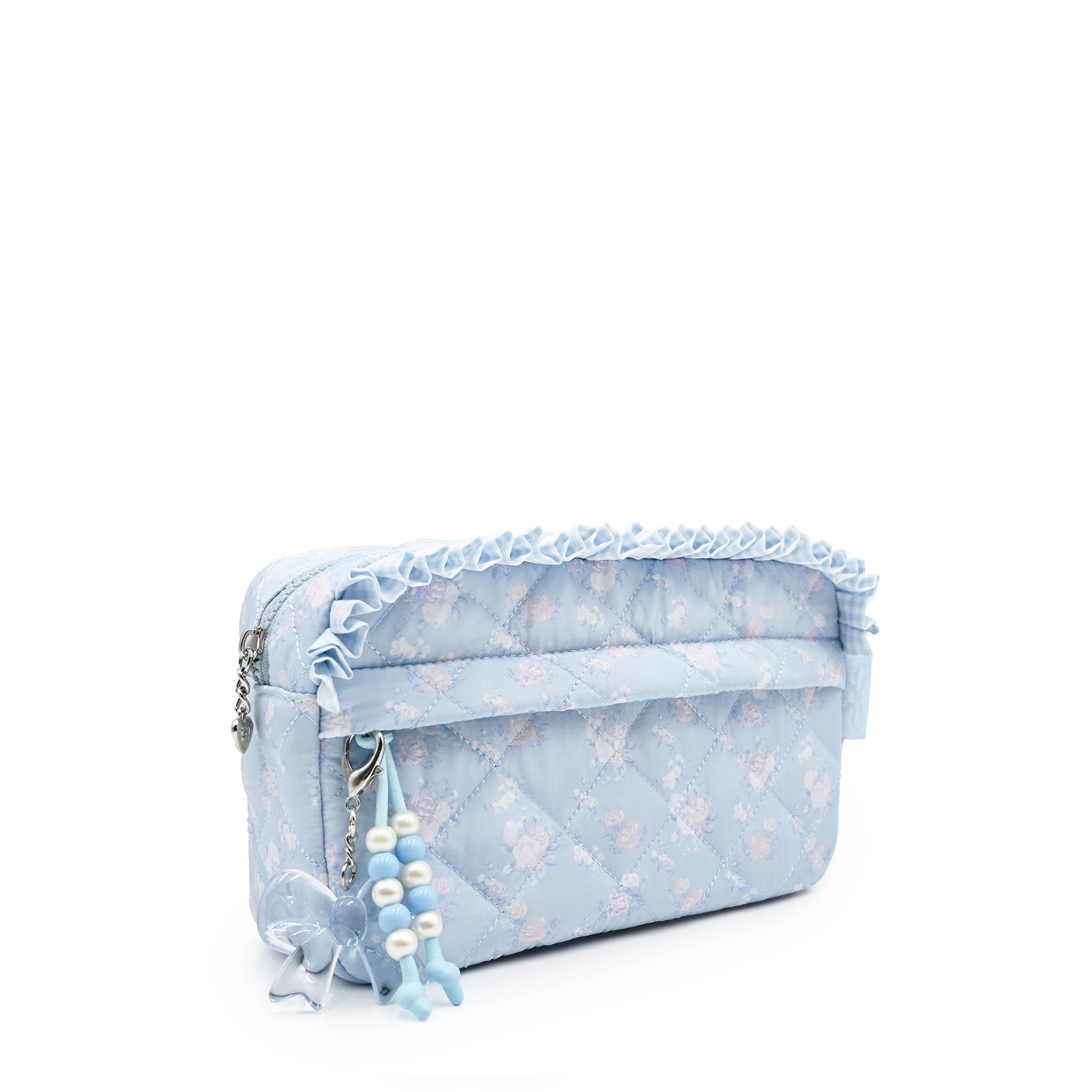 Dainty and sweet- our quilted cosmetic pouch just got the girliest upgrade! With an exterior zipper pocket for extra storage, this storage essential is covered in our frosty blue floral print, features a decorative ruffle detail, and a bow shaped crystal bag charm zipper pull!