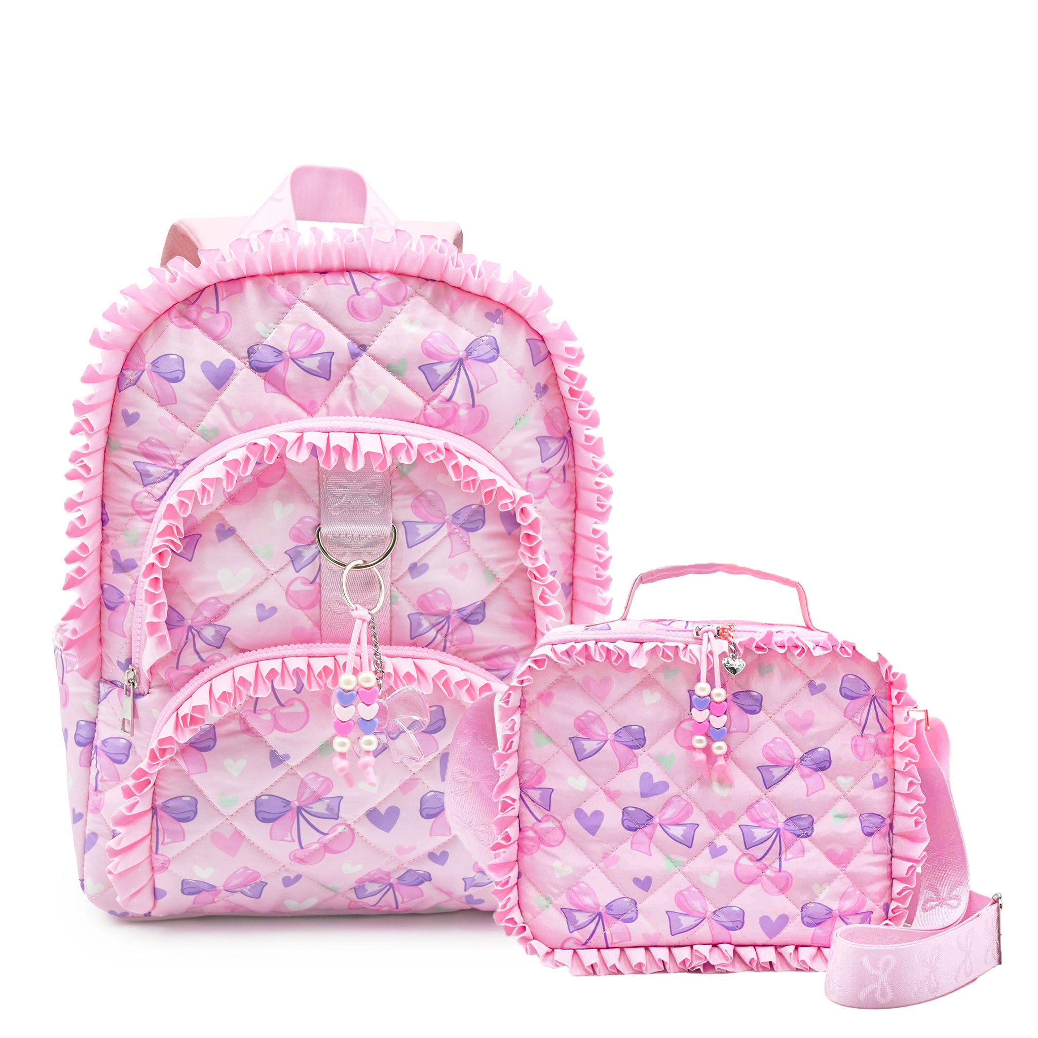 Get perfectly packed with our NEW two-piece set featuring our cherry bow & ruffles backpack paired with a coordinating lunch bag. With a backpack featuring spacious compartments & an insulated lunch bag with an adjustable strap, they'll be prepped for their next weekend trip, camp excursion, or getaway!