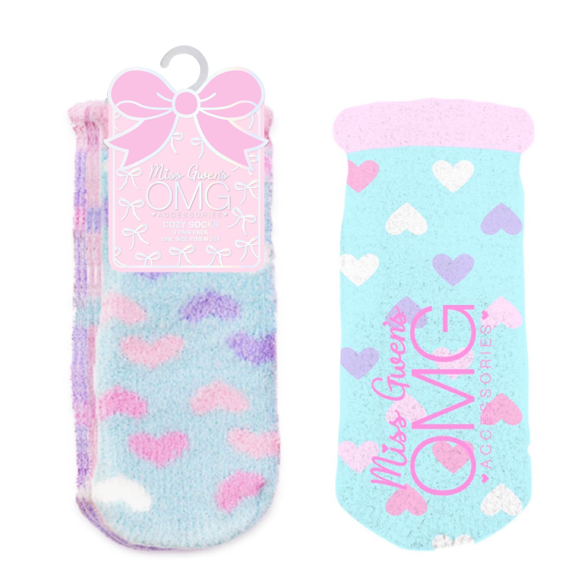 Perfect for little feet on chilly days, meet our three pack cozy slipper sock set. This oh-so-soft set features heart printed socks in light aqua, pink and lavender - with a no slip grip bottom. This set will add a pop of color to their lounge outfits and keep them warm all season long!