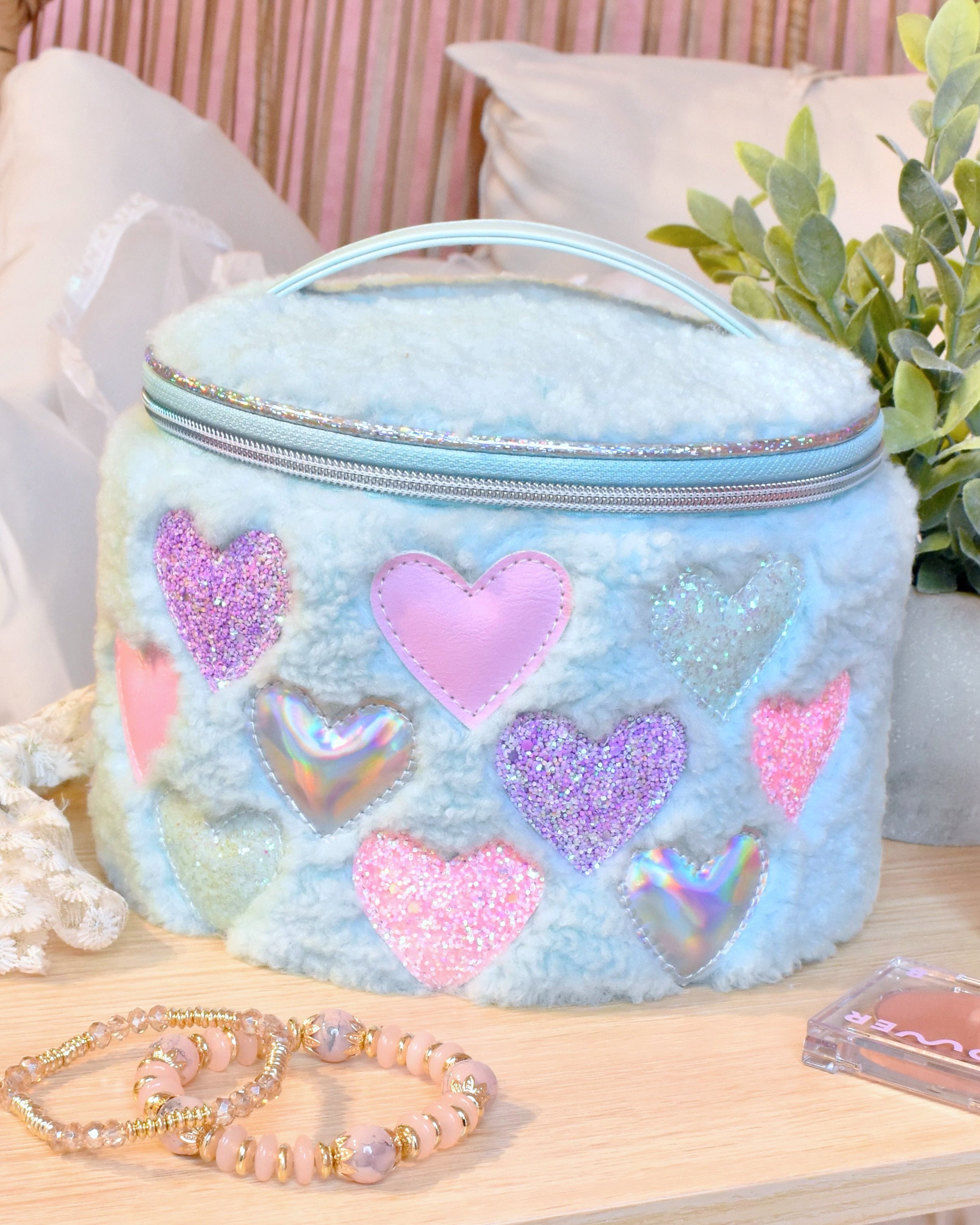 Keep your mini's GRWM routine cute and cozy with this light aqua sherpa round glam bag! Embellished with glitter and holographic heart patches for a touch of glam, it's a storage must-have for every mini MUA's everyday beauty essentials.