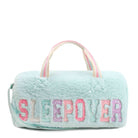 Keep your mini's packing routine cute and cozy this sleepover szn with this light aqua sherpa large barrel duffle bag! Detailed with glitter 'SLEEPOVER' varsity letter applique patches, woven straps, and an adjustable strap. It's a packing must-have for every mini's slumber party essentials.