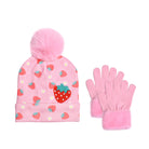 A perfectly cozy sweet combo for all their winter activities! Color-coordinated and featuring a soft knit pattern, this pink strawberry print hat and glove set features a chenille and pearl strawberry applique patch, and plush cuffed pink gloves.