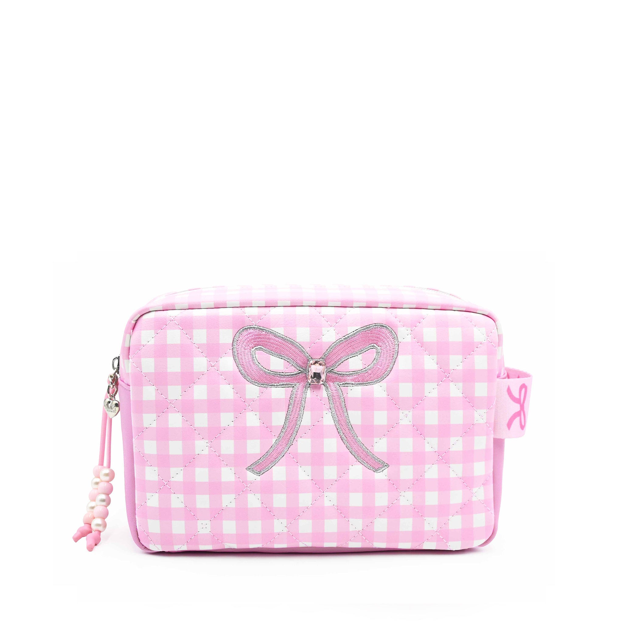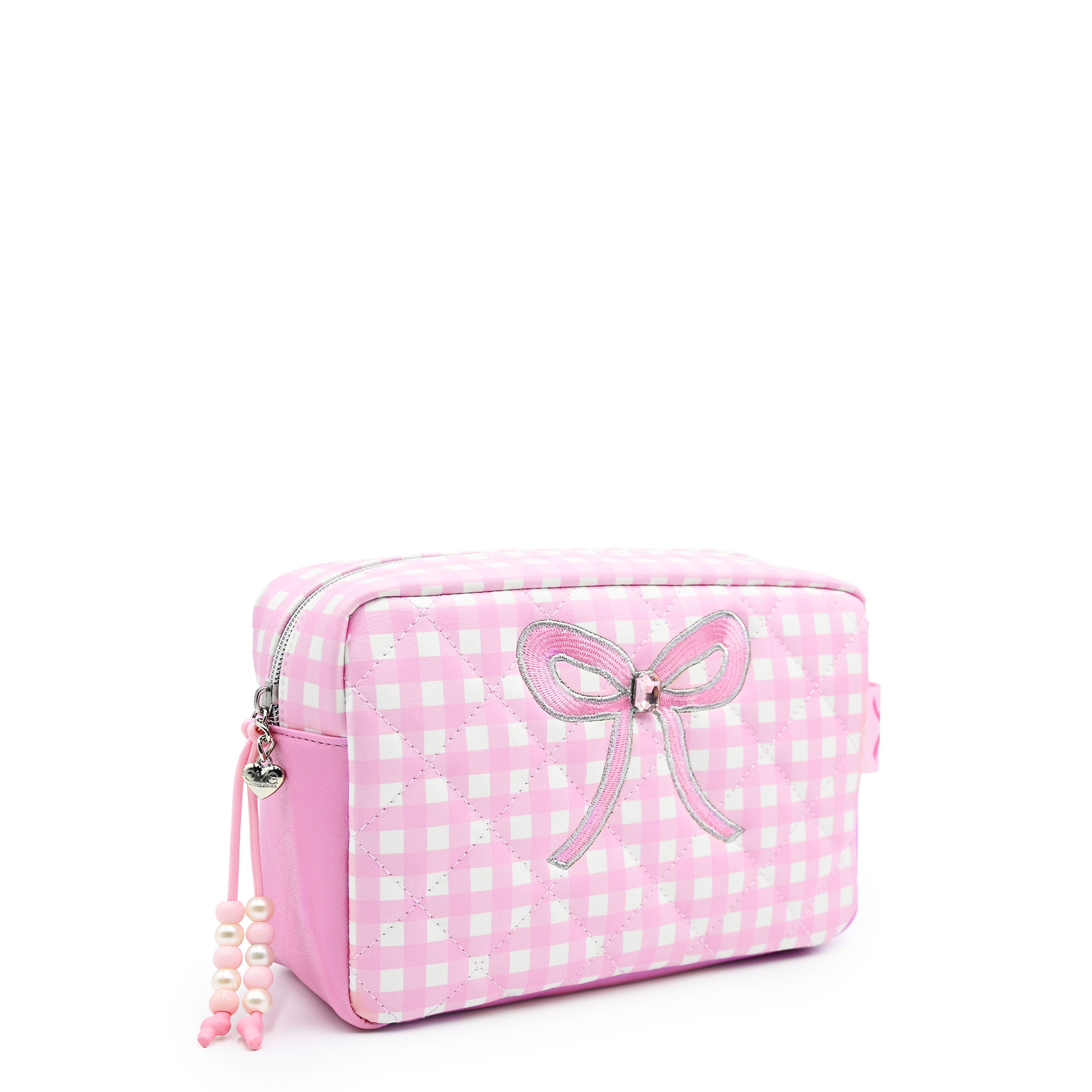 The sweetest way to carry and store every beauty lover's essentials! Our brand new pink and white gingham cosmetic pouch is a must-have for carrying skincare, makeup, and everything in between! Featuring a beaded zipper pull and pink bow patch with rhinestone details for an extra girly touch!