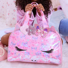 Sweet, stylish, and ready to shine: our new Miss Gwen the unicorn duffle bag is ready to be packed! Filled with confetti and designed with our new cherry bows print. Features a butterfly crown, iconic Miss Gwen lashes, and bow print shoulder straps . They'll be carrying it all from their extra curricular, to dance class, sleepovers, weekend getaways, and everywhere else in between!