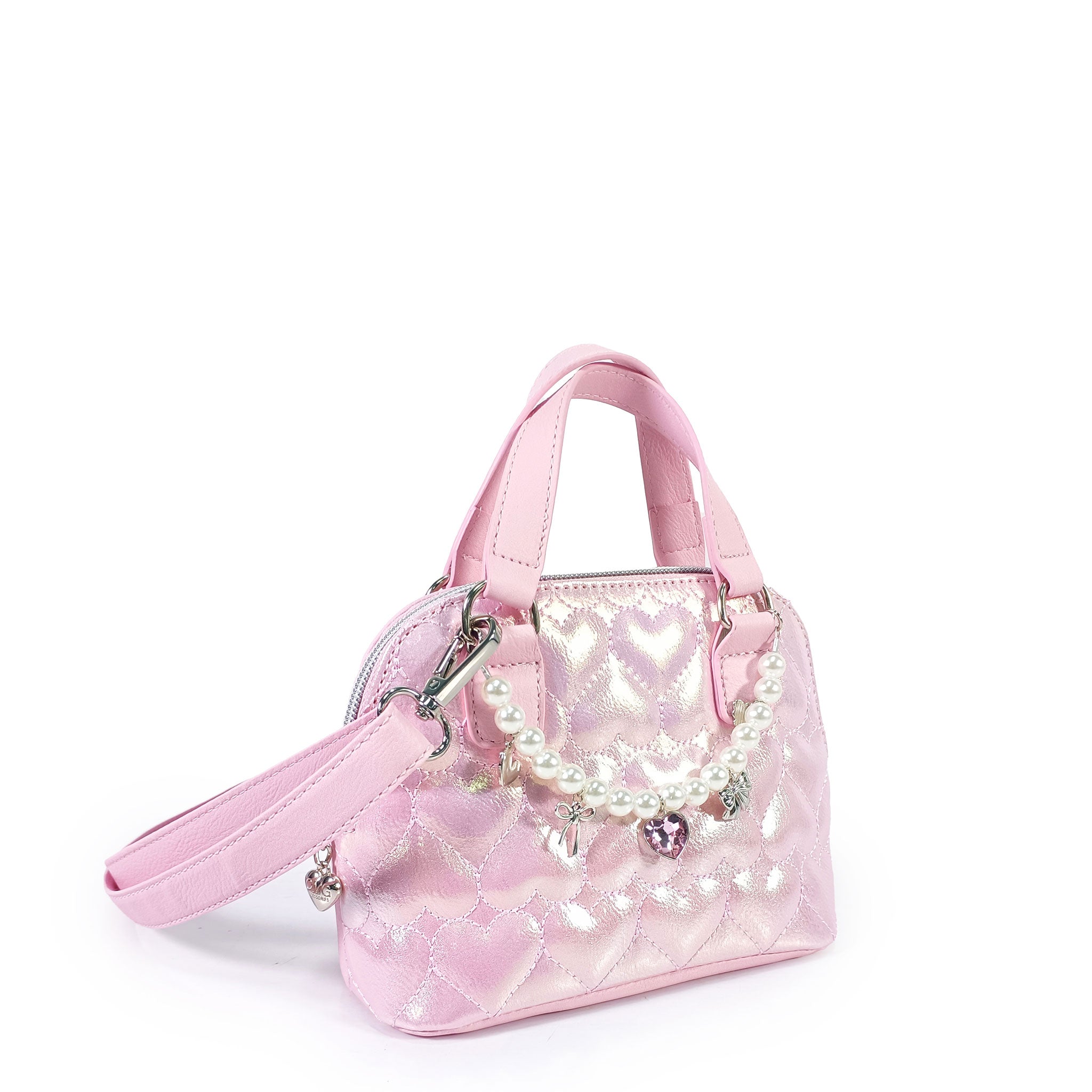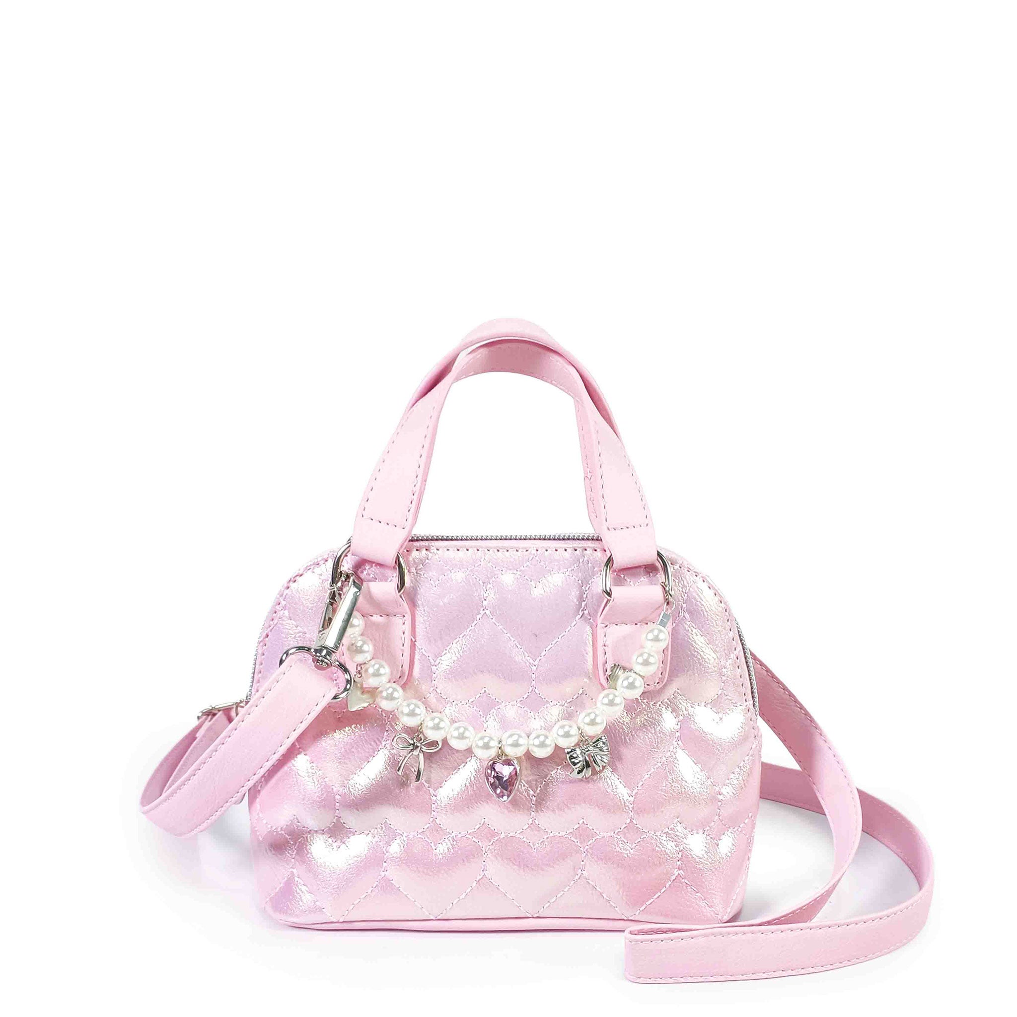 It's a pink lover's paradise! Our all NEW hearts quilted metallic pink satchel crossbody bag is a fashionista's dream! Detailed with a pearl chain decked out in rhinestone heart and ballet themed charms, this top handle mini bag is bound to become a new staple in your little's closet!