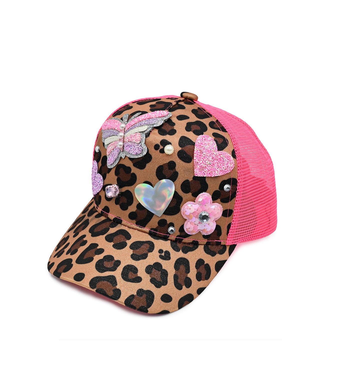 Your mini will be be turning heads in our NEW trucker hat! Featuring a leopard printed front panel adorned-- with glitter heart, butterfly, and daisy appliques, rhinestones, a mesh back for breezy comfort, and an adjustable size strap for the perfect fit!