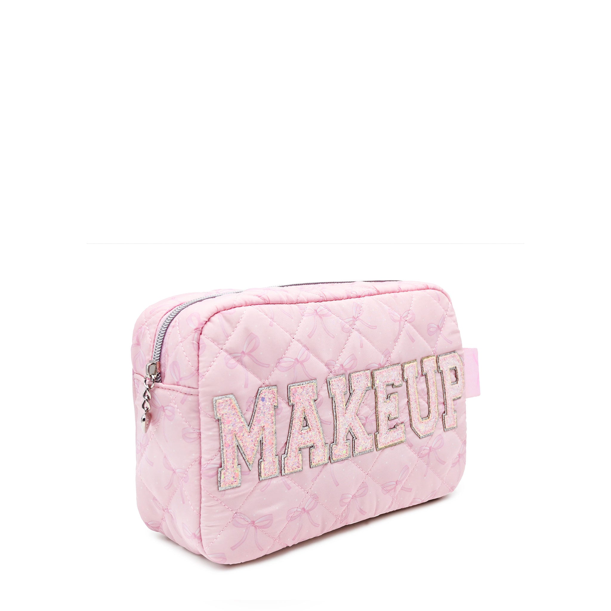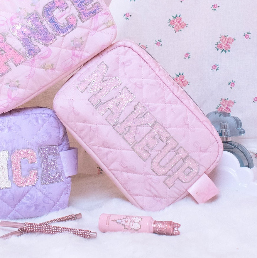 Make every glam moment sweet with our newest 'makeup' pouch in our NEW powder pink bow print! Detailed with extra glittery varsity letters, this storage essential is a must-have for any makeup lover!