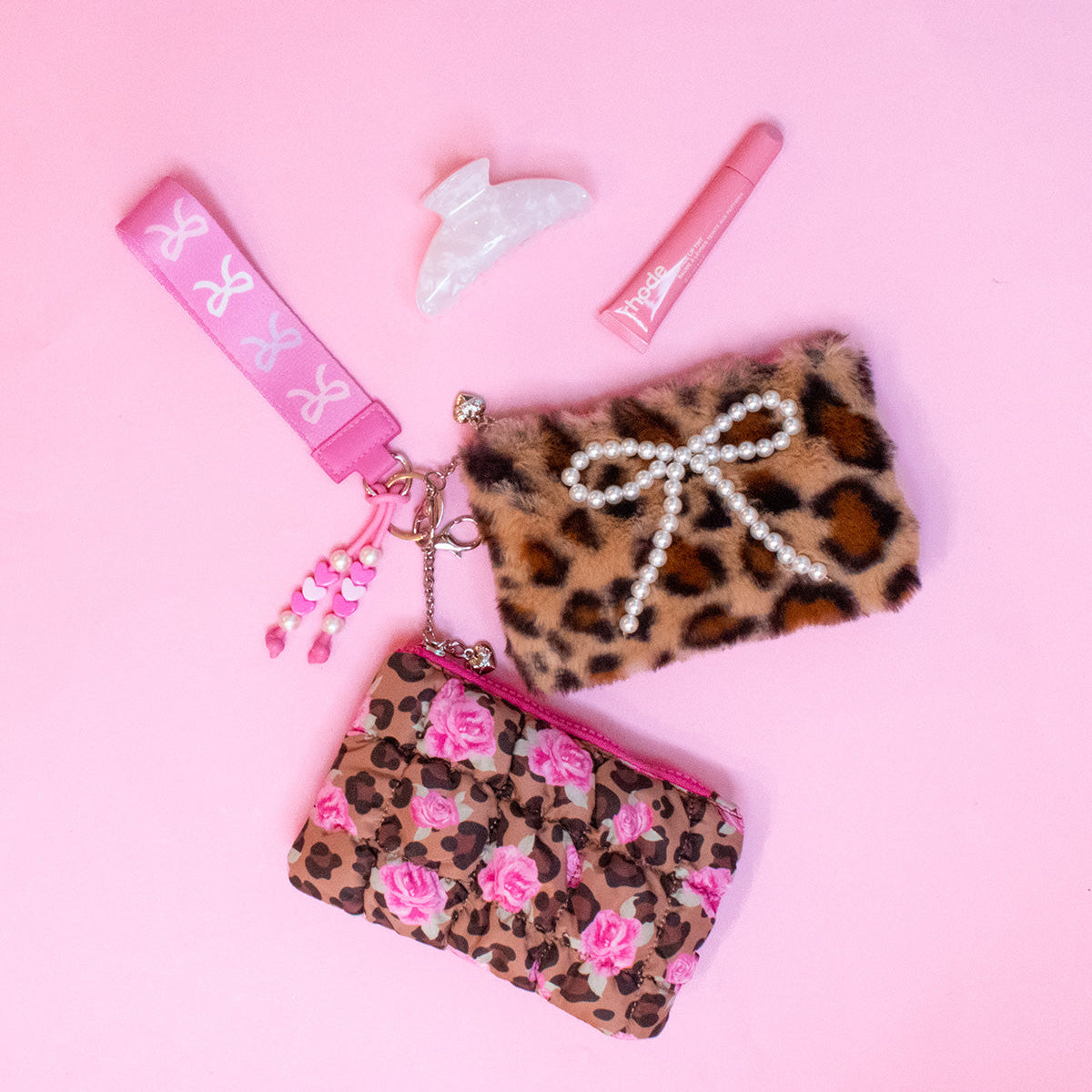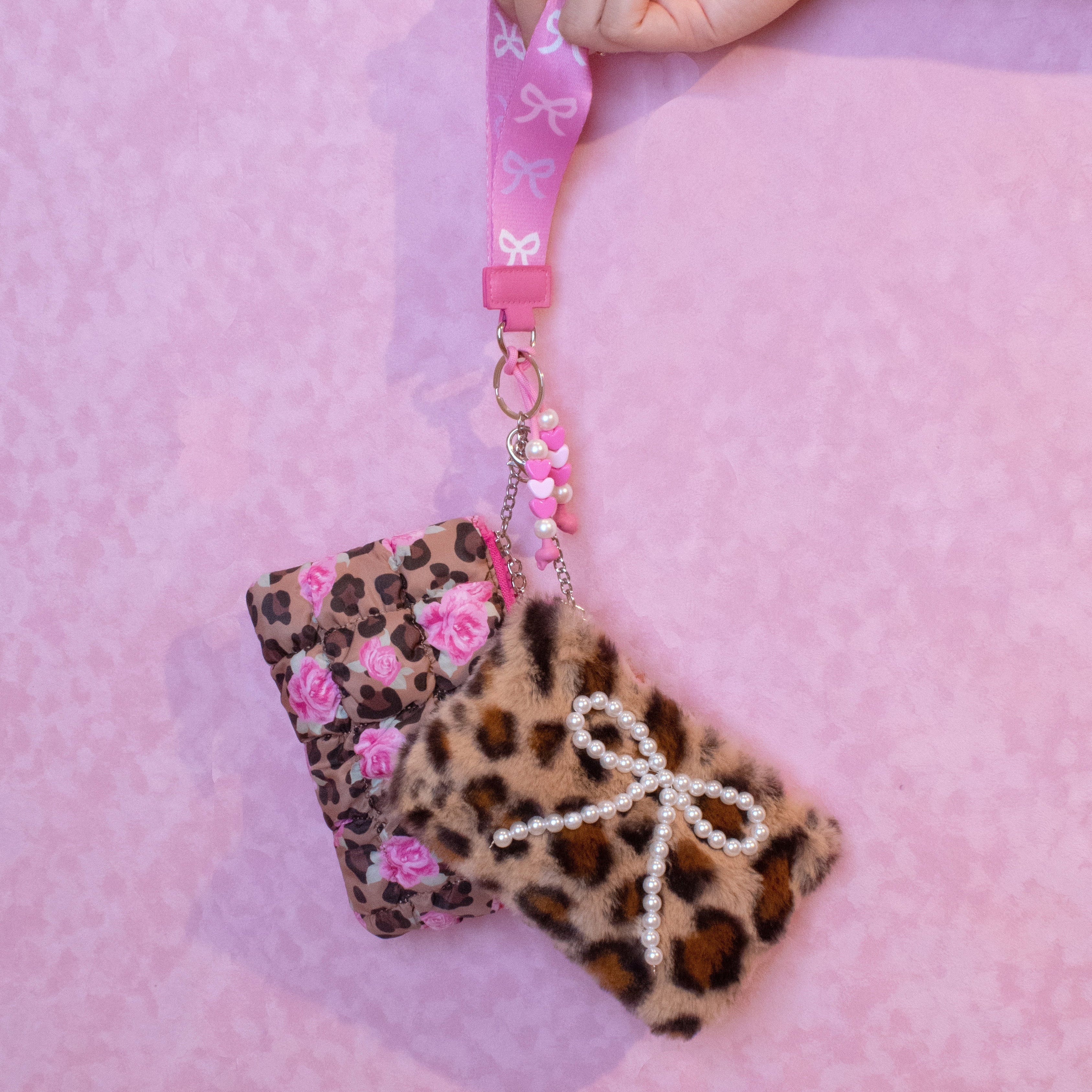 Accessorize your favorite bag with & our wild, new 3 piece bag charm set, featuring a quilted scrunchies leopard & rose pouch, a plush leopard coin pouch, and a detachable heart printed wrist strap for extra functionality! Add it to a bag or wear it as a mini wristlet!
